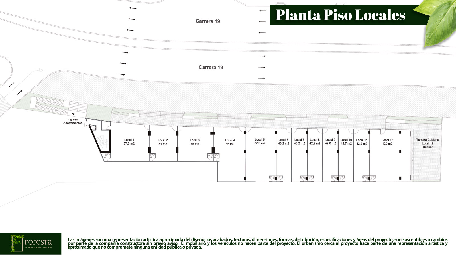 Foresta cuenta con una variada y exclusiva oferta de locales comerciales, ideales para múltiples alternativas de uso. Nuestros locales comerciales se ubican dándole frente a la carrera 19, una de las vías de mayor actividad y desarrollo del norte de la ciudad. Los locales varían en áreas desde 40 a 80m² hasta grandes superficies de 500m².